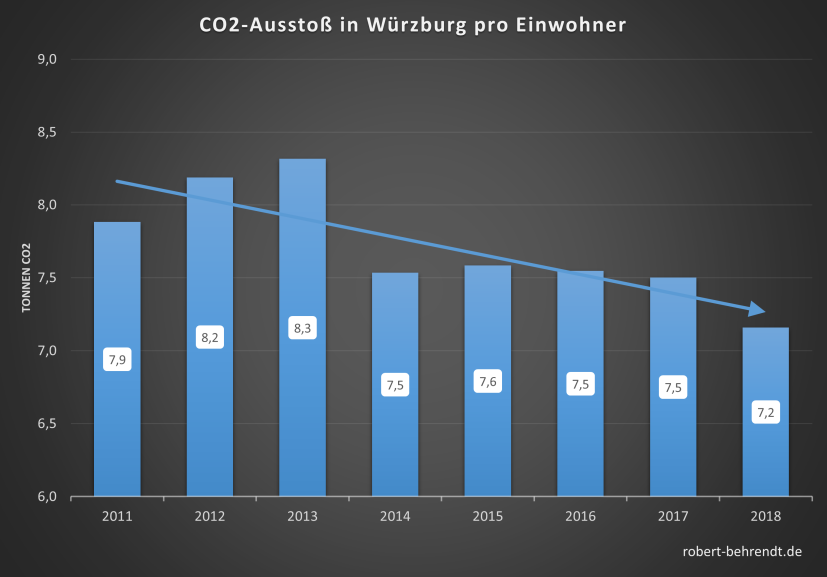 Die Autos und LKWs in Würzburg sind der Hauptgrund, dass Würzburg sein selbstgestecktes Ziel von 50% CO2-Reduzierung 2020 gegenüber 1990 mit Sicherheit nicht erreichen wird. Wie überall in Deutschland hat der Autoverkehr leicht zugenommen. Wirtschaftswachstum und Bevölkerungszunahme sind die Gründe. Beim Autoverkehr muss also am meisten getan werden. Durch die Änderung des Verkehrsmix, wenn weniger Autofahrten stattfinden ist schon einmal viel erreicht. Für eine umfassende, flexible Mobilität sind aber Autos nötig, auch im privaten Eigentum. Sie werden in Zukunft weniger genutzt, werden uns aber erhalten bleiben. Jedoch angetrieben ohne fossile Energieträger.