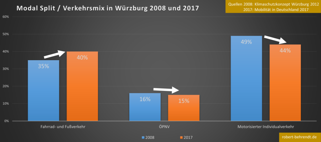 Um die Anteile am Verkehrsmix messen zu können wird der Modalsplit ermittelt. In Würzburg zeigt sich, dass es leichte Veränderungen gab, der ÖPNV aber noch ausbaufähig ist.